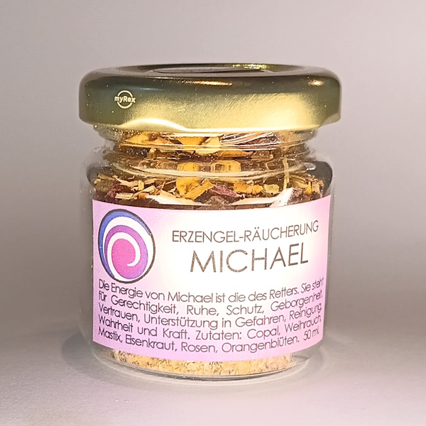 Die Energie von Michael ist die des Retters. Sie steht für Gerechtigkeit, Ruhe, Schutz, Geborgenheit, Vertrauen, Unterstützung in Gefahren, Reinigung, Wahrheit und Kraft. Zutaten: Copal, Weihrauch, Mastix, Eisenkraut, Rosen, Orangenblüten. 50 ml.